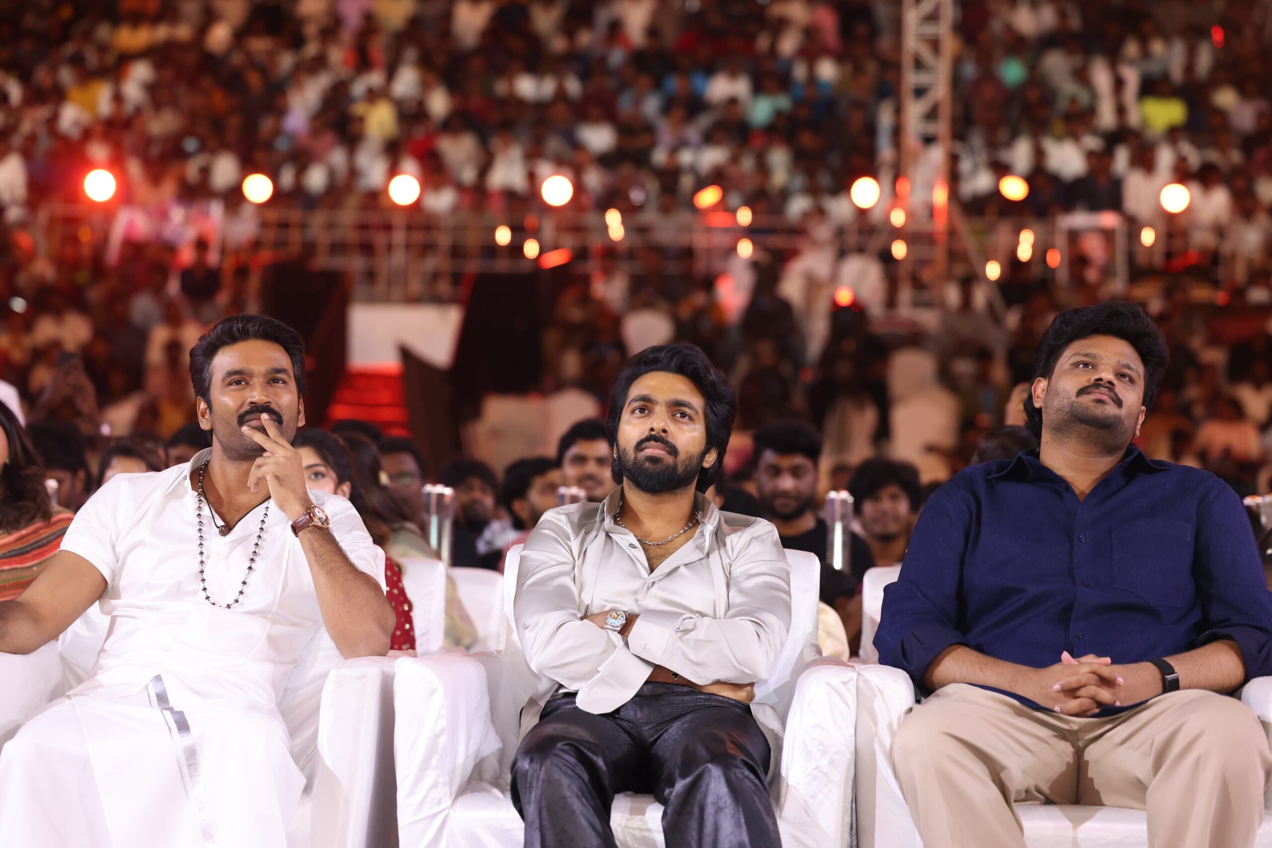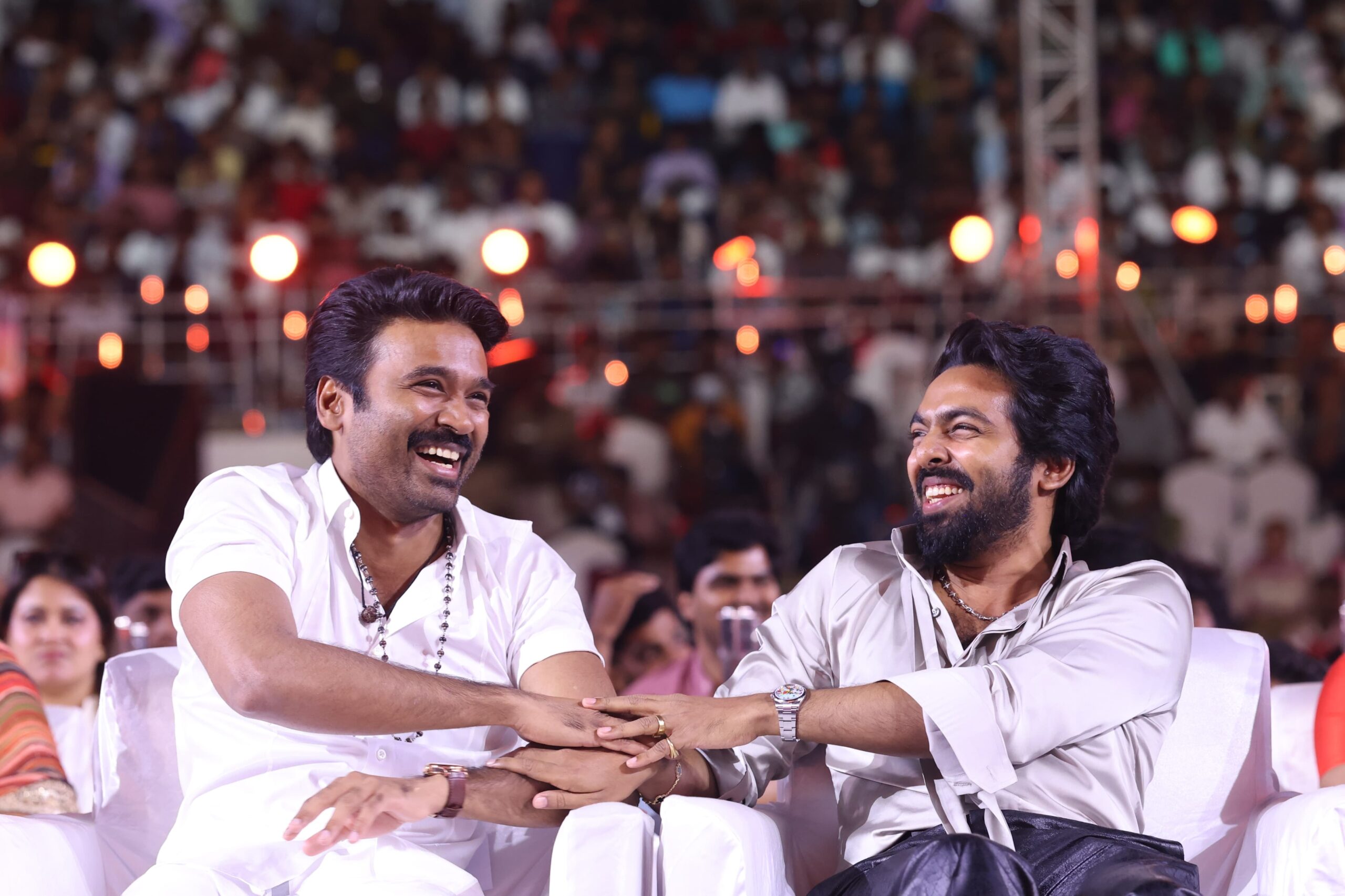 என் இனிய நண்பர் இயக்குநர்-நடிகர் தனுஷ் அவருக்கும், இந்த அரங்கத்தை கோலாகலமாக வைத்திருக்கும் தனுஷ் ரசிகர்களுக்கும் வணக்கம். ஒரு ஊரில் ஒரு ராஜா. அவருக்கு இரண்டு இளவரசர்கள்—ஒருவர் ஆயிரத்தில் ஒருவன், மற்றவர் பத்தாயிரத்தில் ஒருவன். எந்த வாய்ப்பும் கிடைத்தால் அதில் வித்தகனாக இருப்பவர் இந்த இளையவர் தனுஷ் தான். யாத்ரா, லிங்கா படங்களில் இருவருக்கும் எனக்கு பொறாமை. டப்பிங்கில் தனுஷ் சாருடன் பேசும்போது, அவர் வைத்திருந்த போனை பார்த்து “போன் நம்பர் தர முடியுமா?” என்றேன். அவர் சொன்னார், “இது என் பசங்களிடம் மட்டுமே பேசுவதற்கானது.”